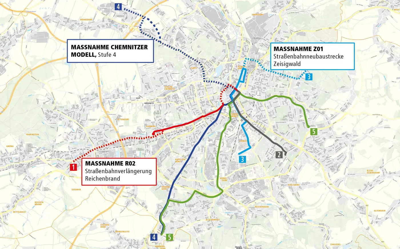 In order to further advance public transport in our city and make it attractive to even more people, we are constantly working on expanding our tram network. In addition to the new lines that we are planning as part of the Chemnitz model  together with the Central Saxony transport association, in German Verkehrsverbund Mittelsachsen (VMS) and the city of Chemnitz, we are primarily responsible for the route network expansions towards Zeisigwald and Reichenbrand.