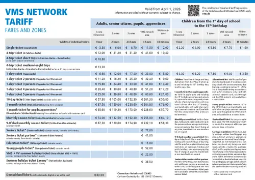 Uniform fare zone-dependent fares apply within the network. They depend on the number of fare zones used between your starting point and destination and the desired ticket. The number of fare zones determines the required fare level. From four fare zones upwards, the “Verbundraum” fare level applies.