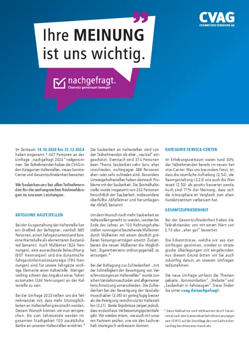 Im Zeitraum 14.10.2024 bis 31.12.2024 haben insgesamt 1.047 Personen an der Umfrage „nachgefragt 2024“ teilgenommen. Die Teilnehmenden haben die CVAG in den Kategorien Haltestellen, neues Service-Center und Gesamtzufriedenheit bewertet. Wir bedanken uns bei allen Teilnehmenden für die umfangreichen Rückmeldungen zu unseren Leistungen.