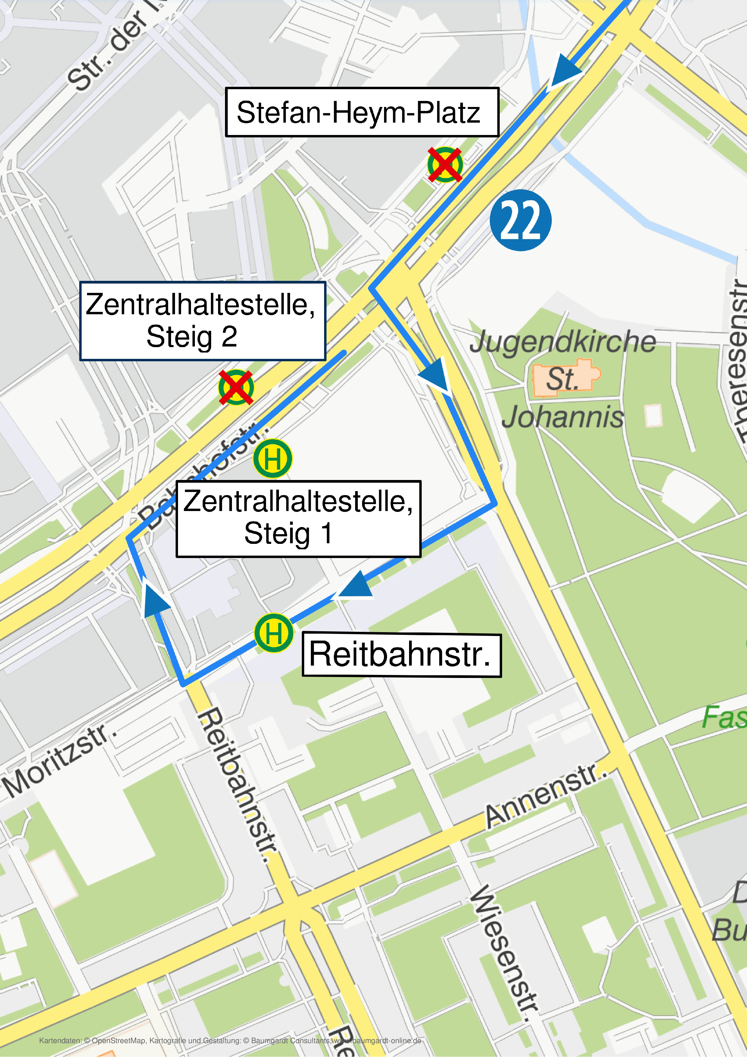 - Entfall der Hst. Stefan-Heym-Platz und Zentralhaltestelle Steig 2