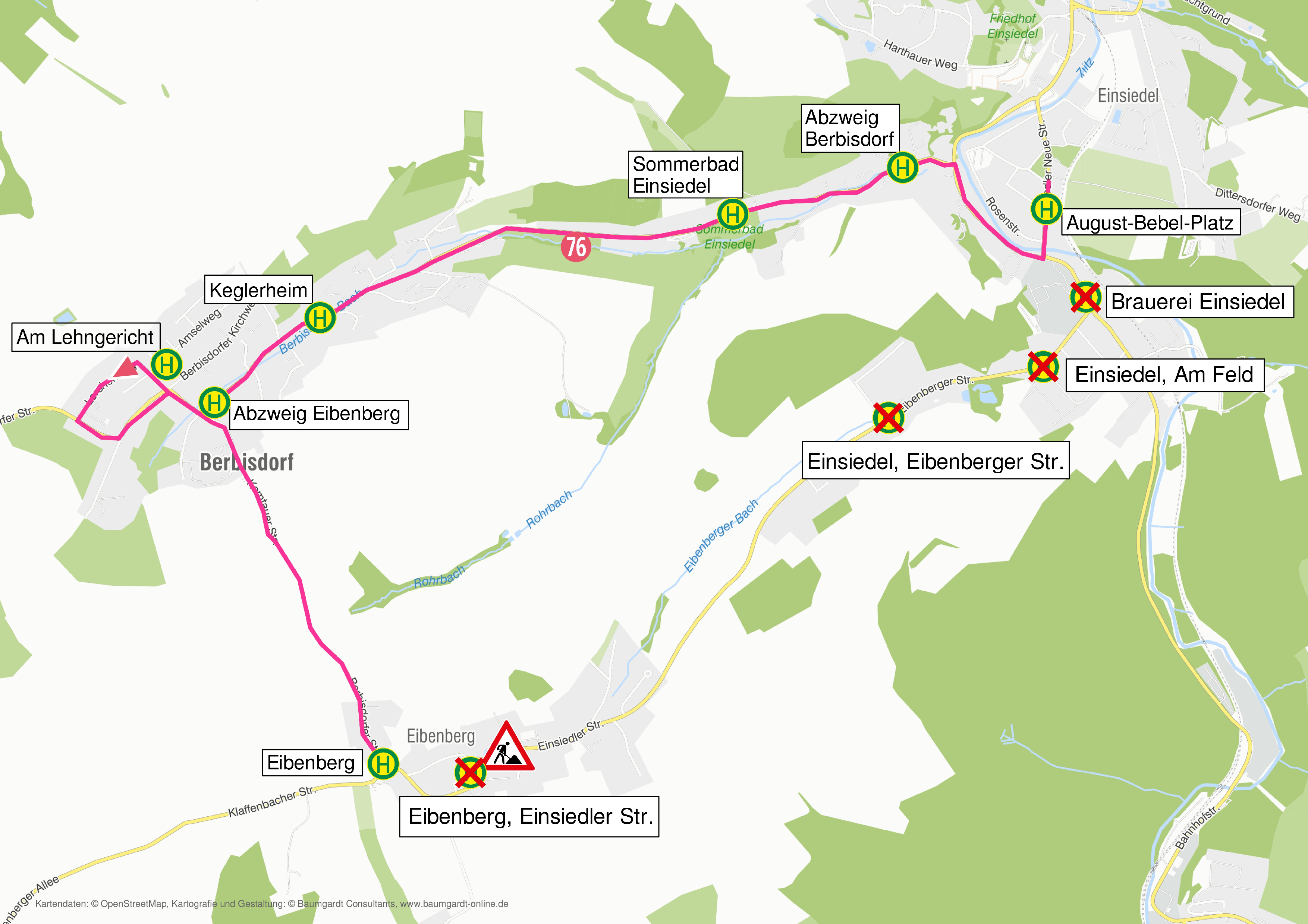 Alle Fahrten verkehren ab Endstelle Eibenberg über die Berbisdorfer Straße zum Bahnhof Einsiedel.