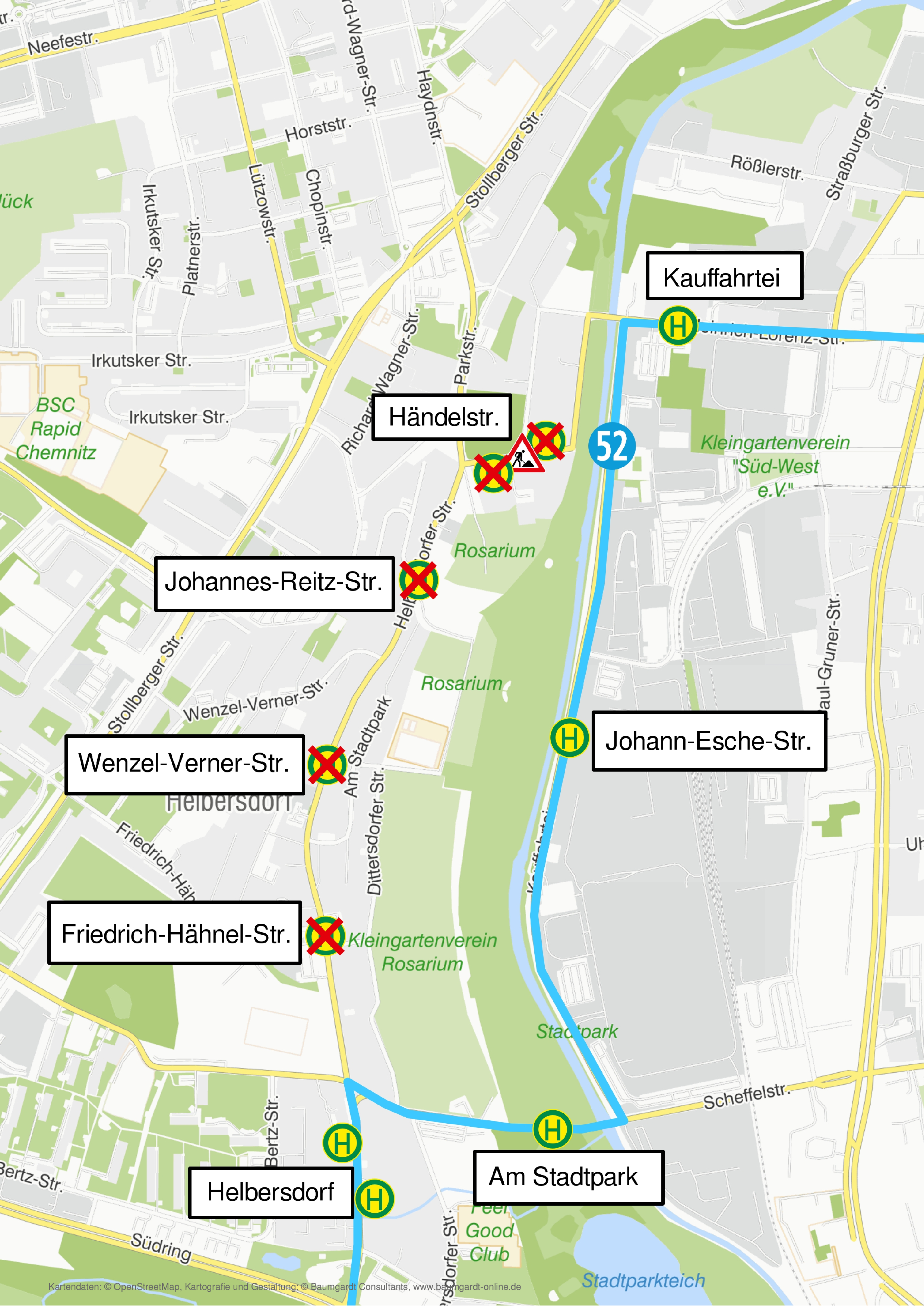 - Entfall der Hst. Rößlerstr., Heinrich-Lorenz-Str. und Kauffahrtei