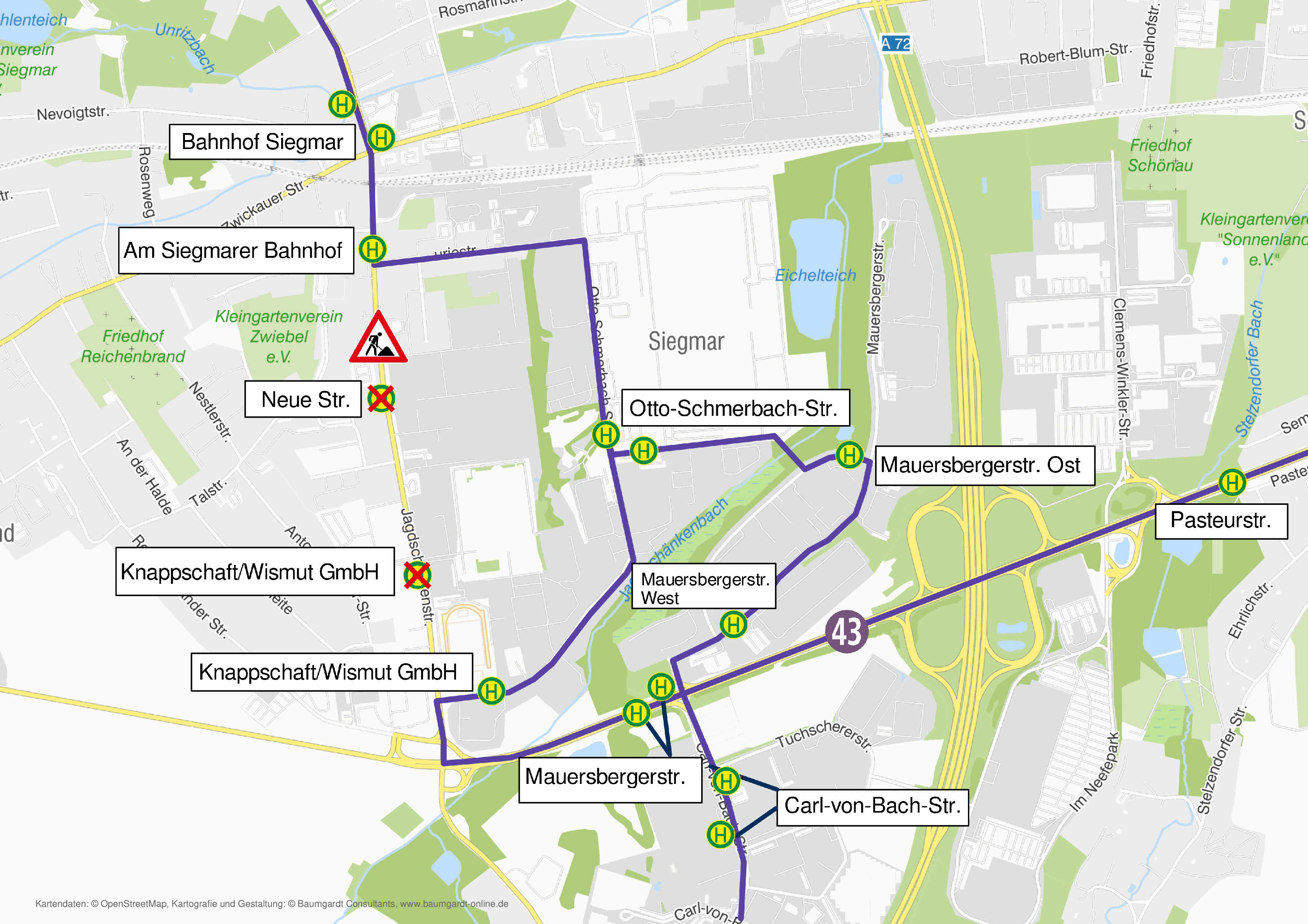 - Entfall der Hst. Knappschaft/Wismut GmbH und Neue Str.