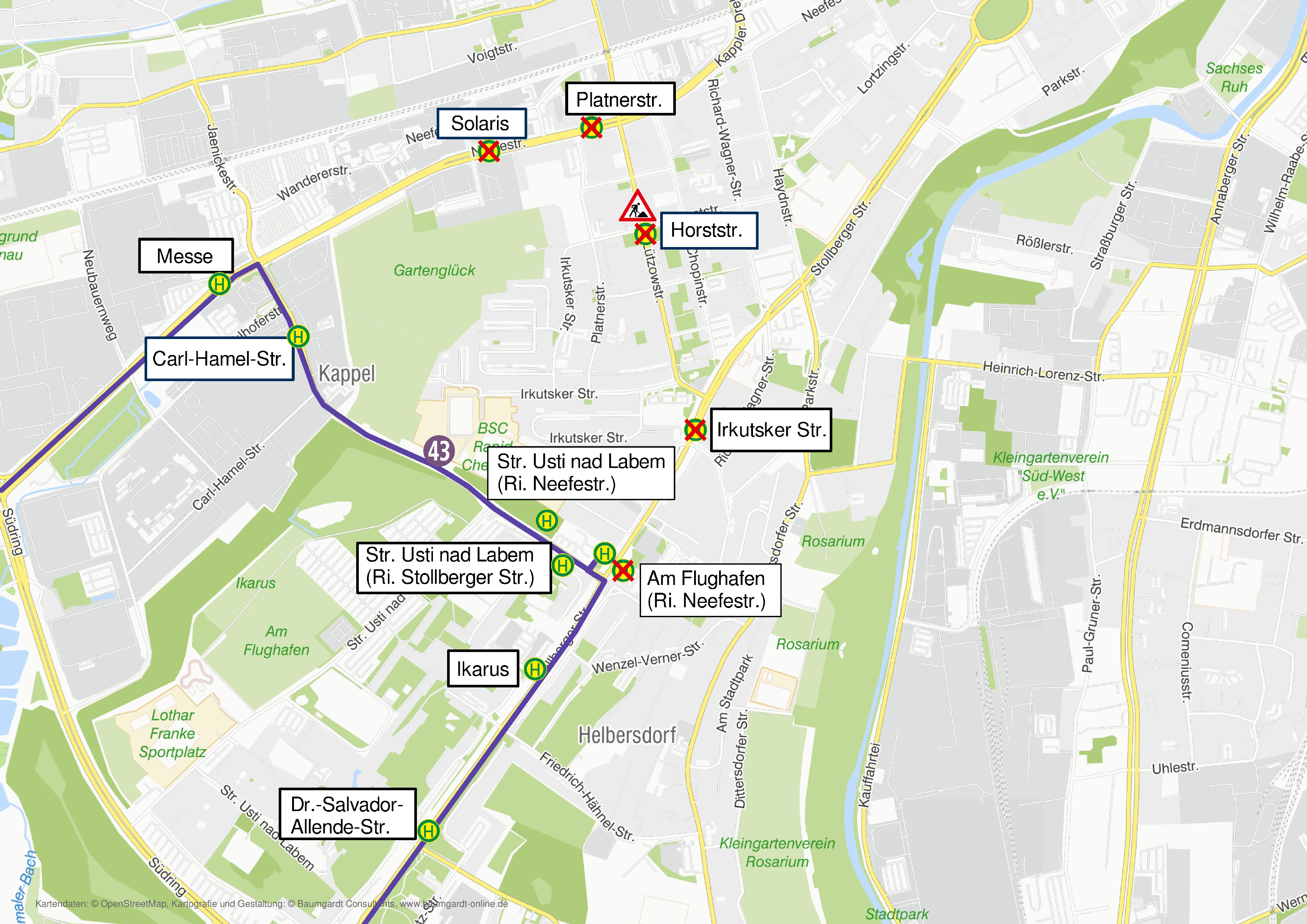 - Entfall der Hst. Solaris, Platnerstr., Horststr., Irkutsker Str. und Am Flughafen