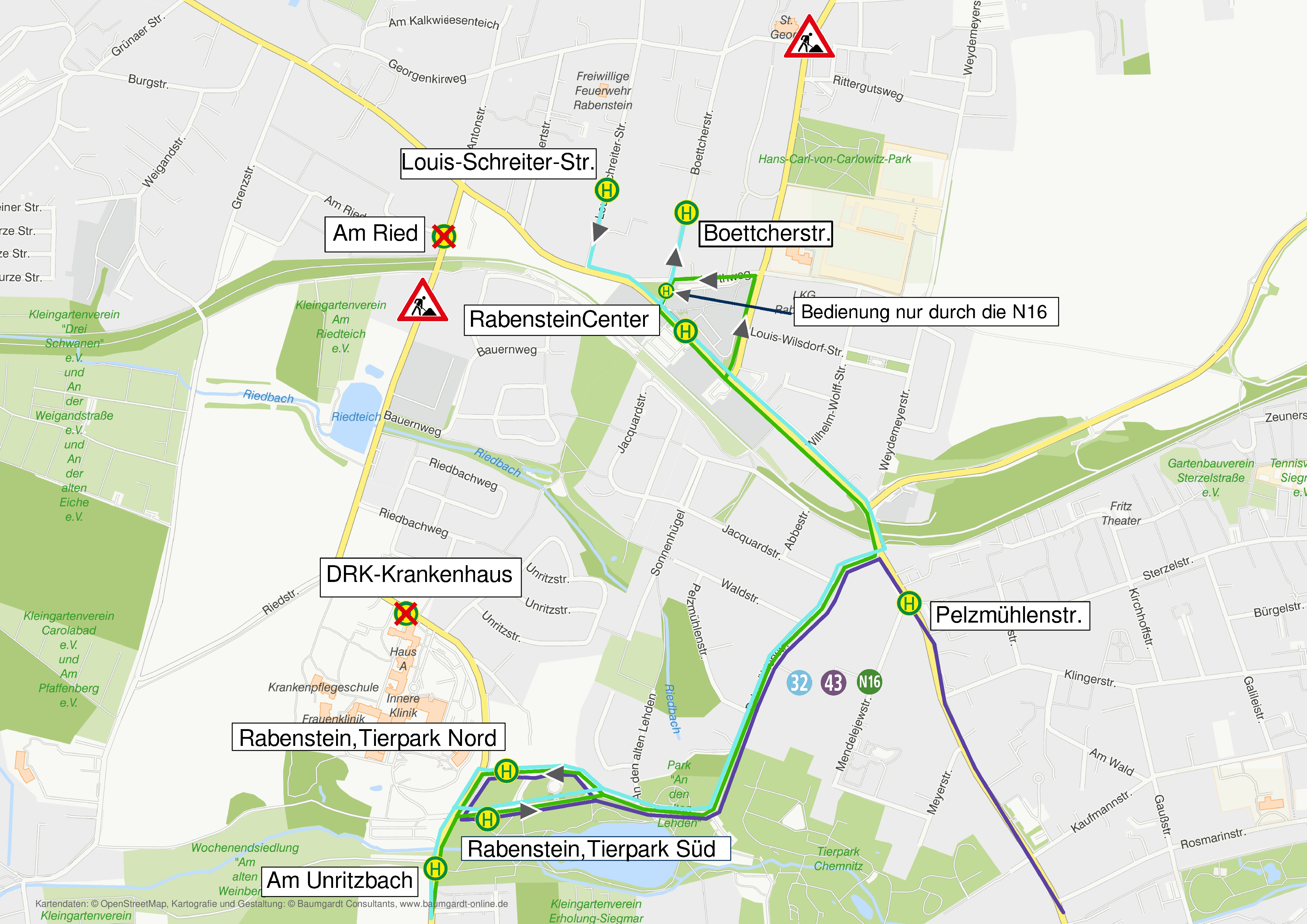 Haltestellen: DRK-Krankenhaus, Am Ried, Rabenstein Tierpark